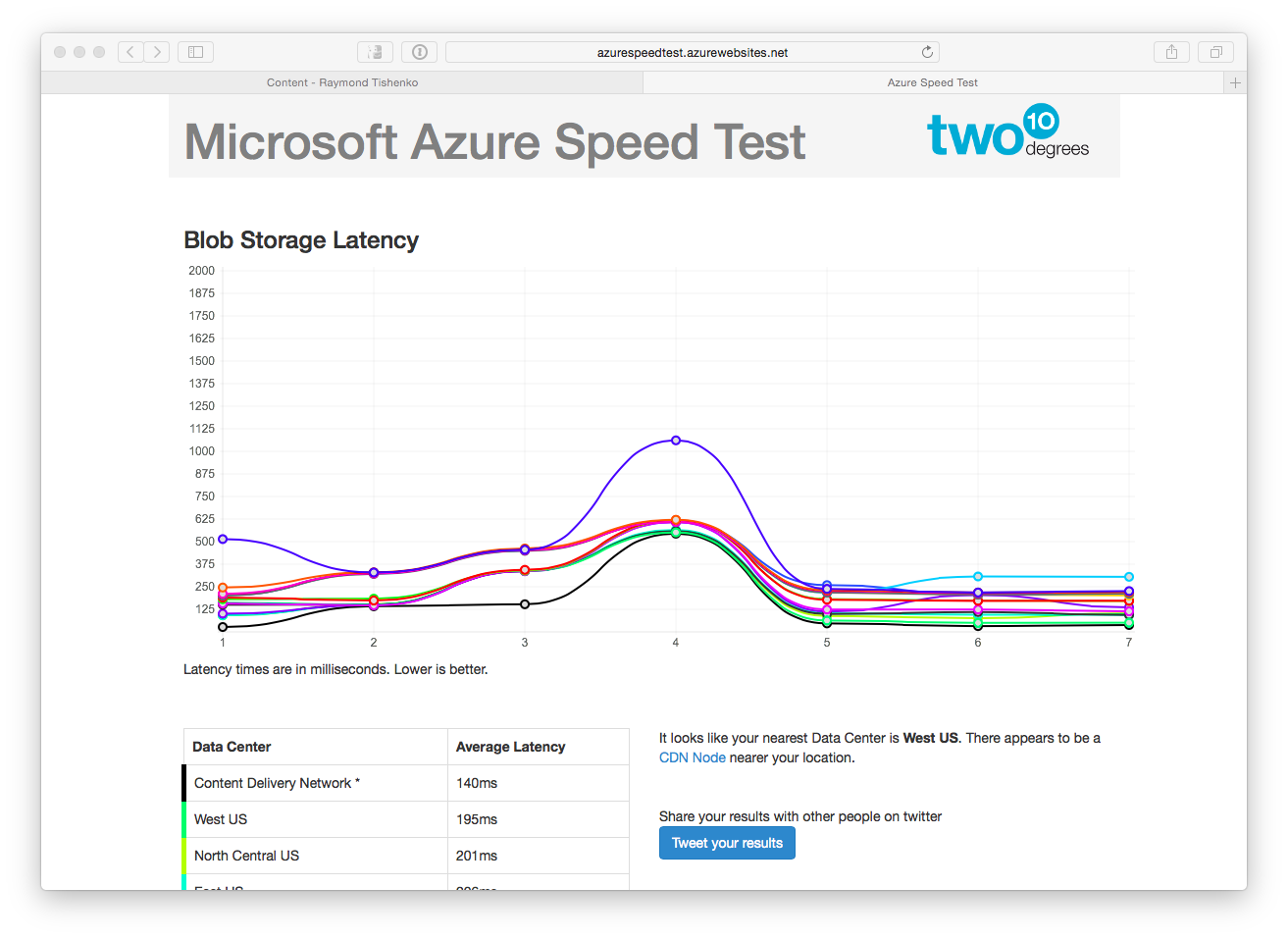 This is purely informational, but gives you an idea of what you'd encounter when using the BLOB storage as well as the Content Delivery Network (CDN) provided by Microsoft Azure. From a planning perspective, this is a great tool to being investigating the impact of latency as introduced by accessing the remote cloud services.